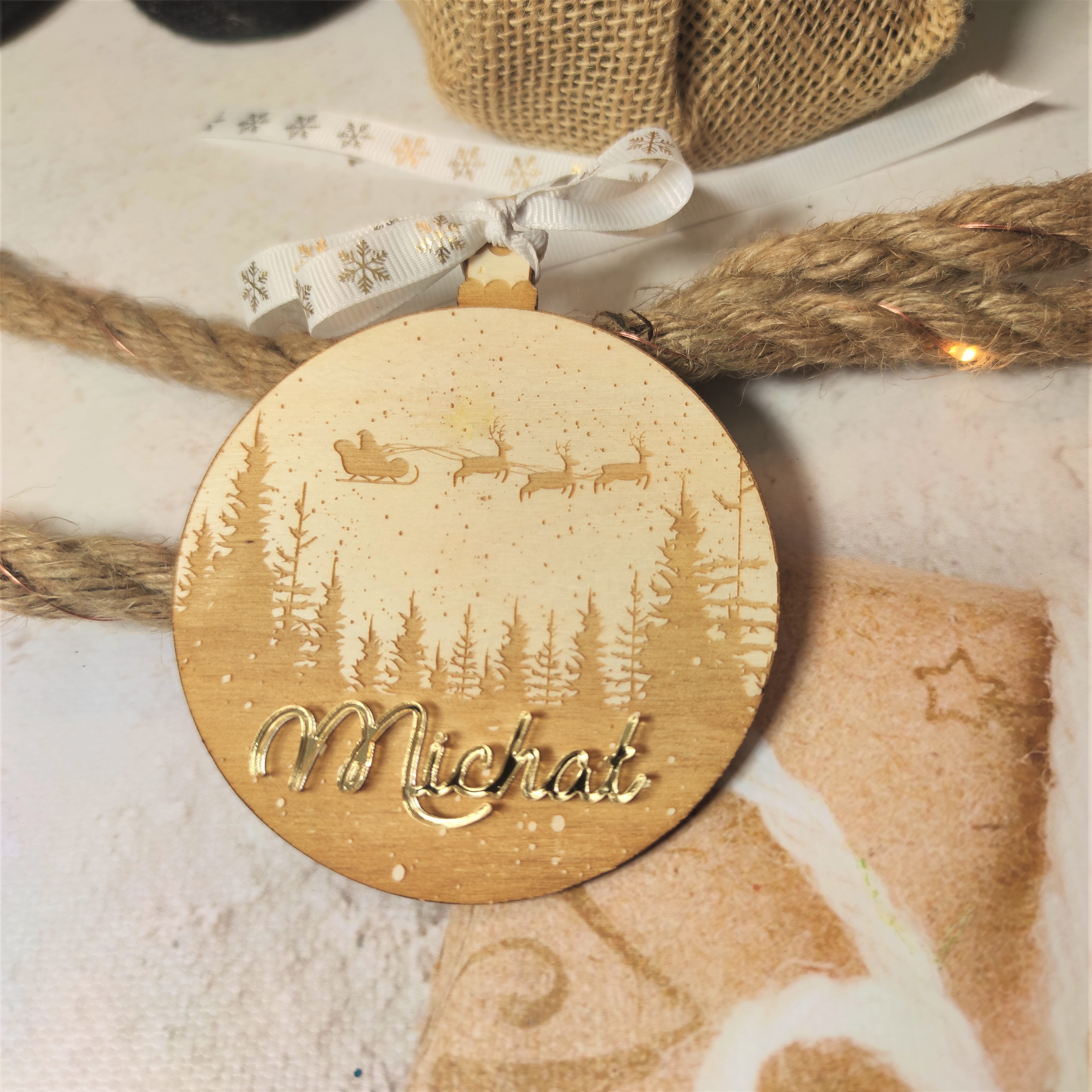 Bombki wykonane z drewna a imię z plexi lustrzanej złotej - pięknie błyszczy.