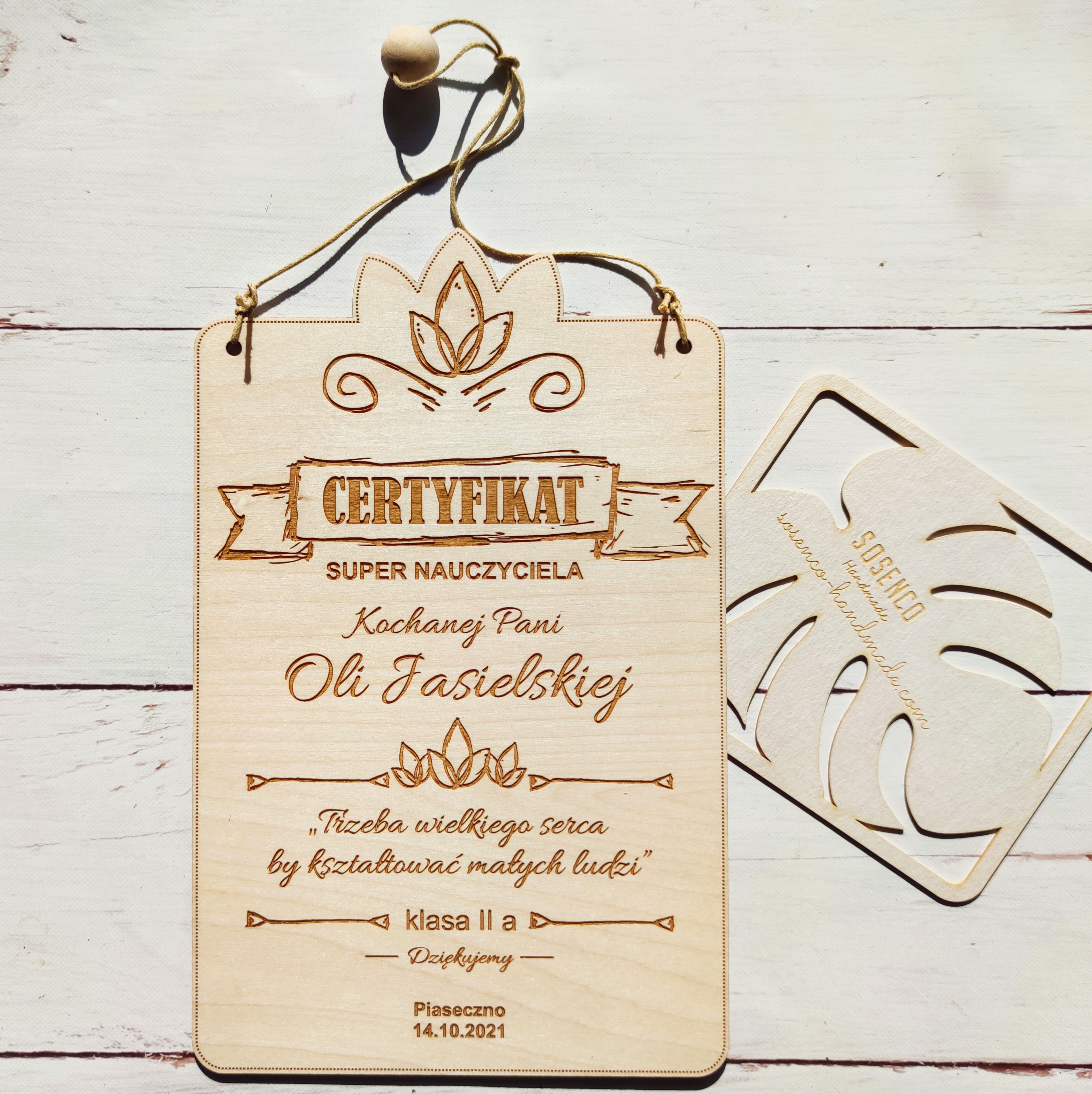 Wspaniały, grawerowany, wykonany ze sklejki certyfikat - będzie wspaniałym prezentem na dzień edukacji narodowej.