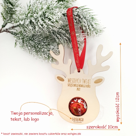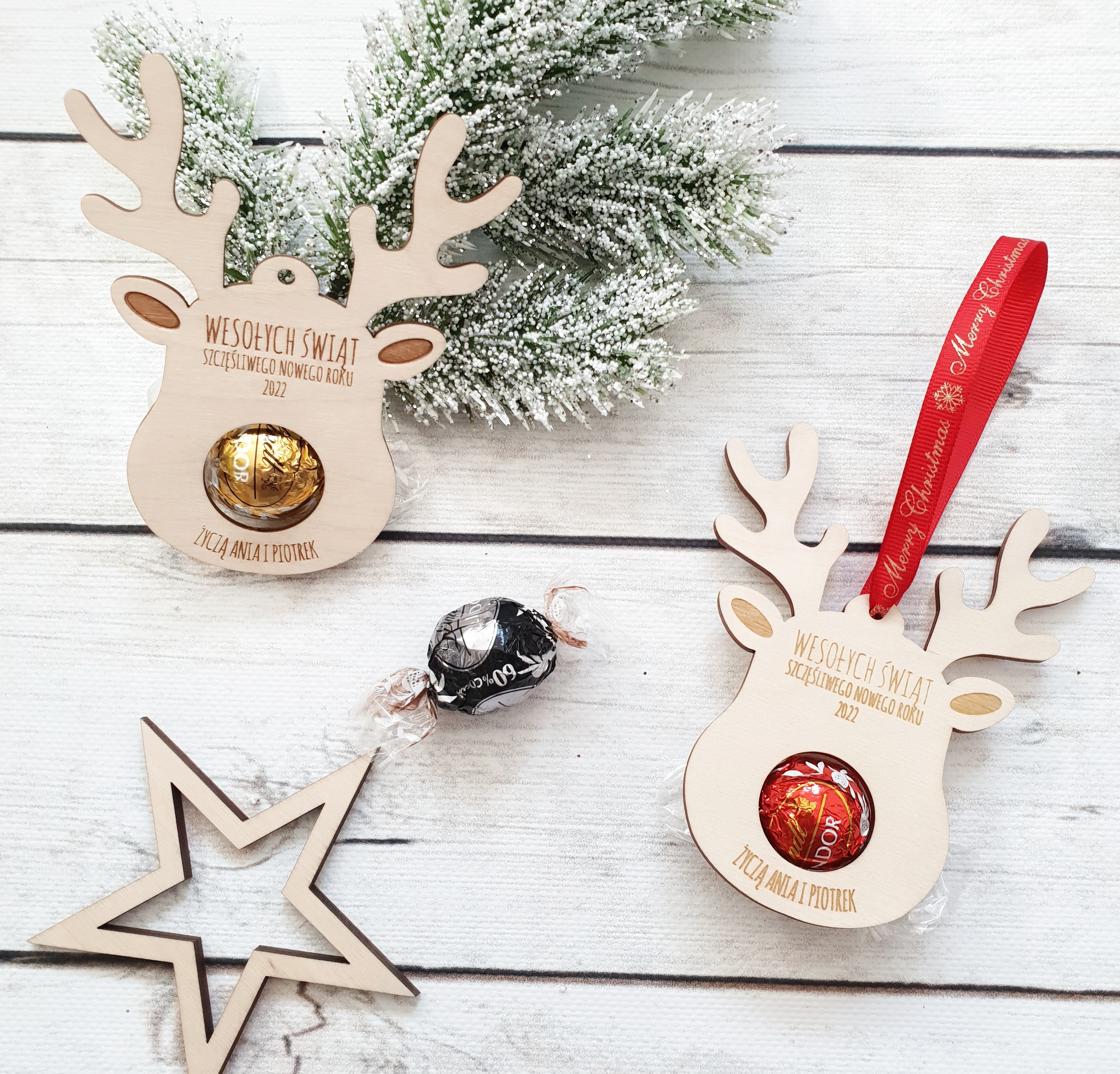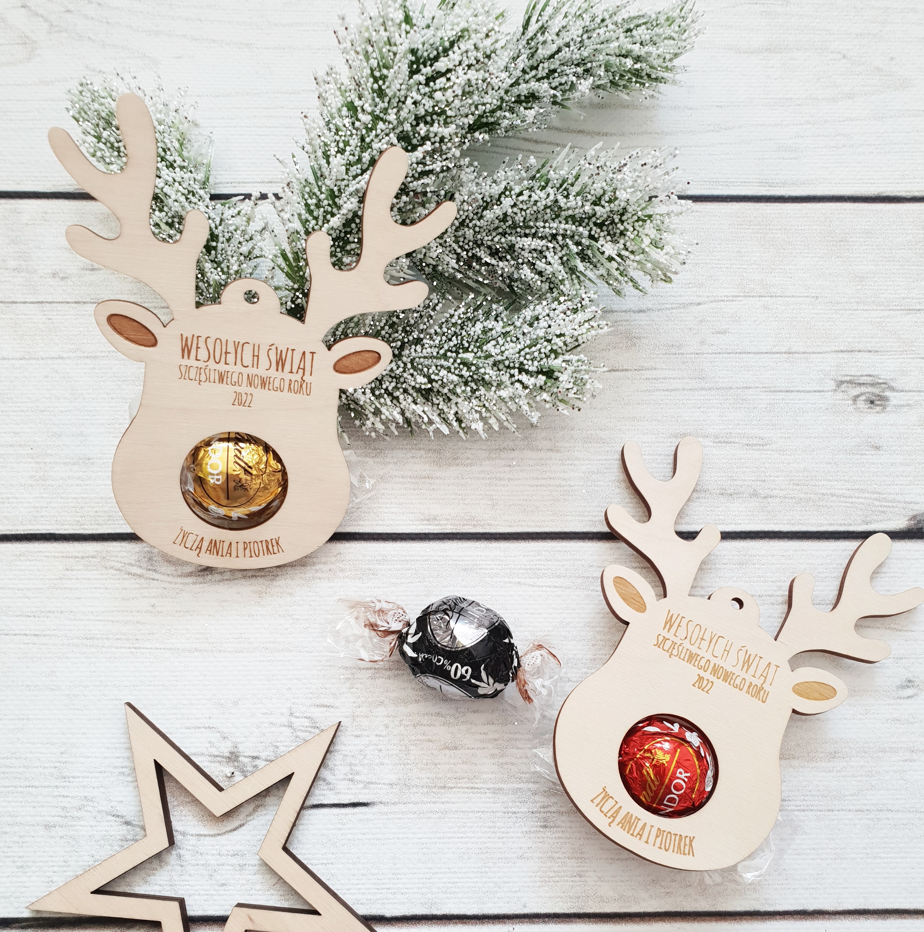 Zestaw nie zawiera czekoladkek i wstążeczek - są to same drewniane reniferki - spersonalizowane.