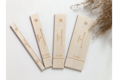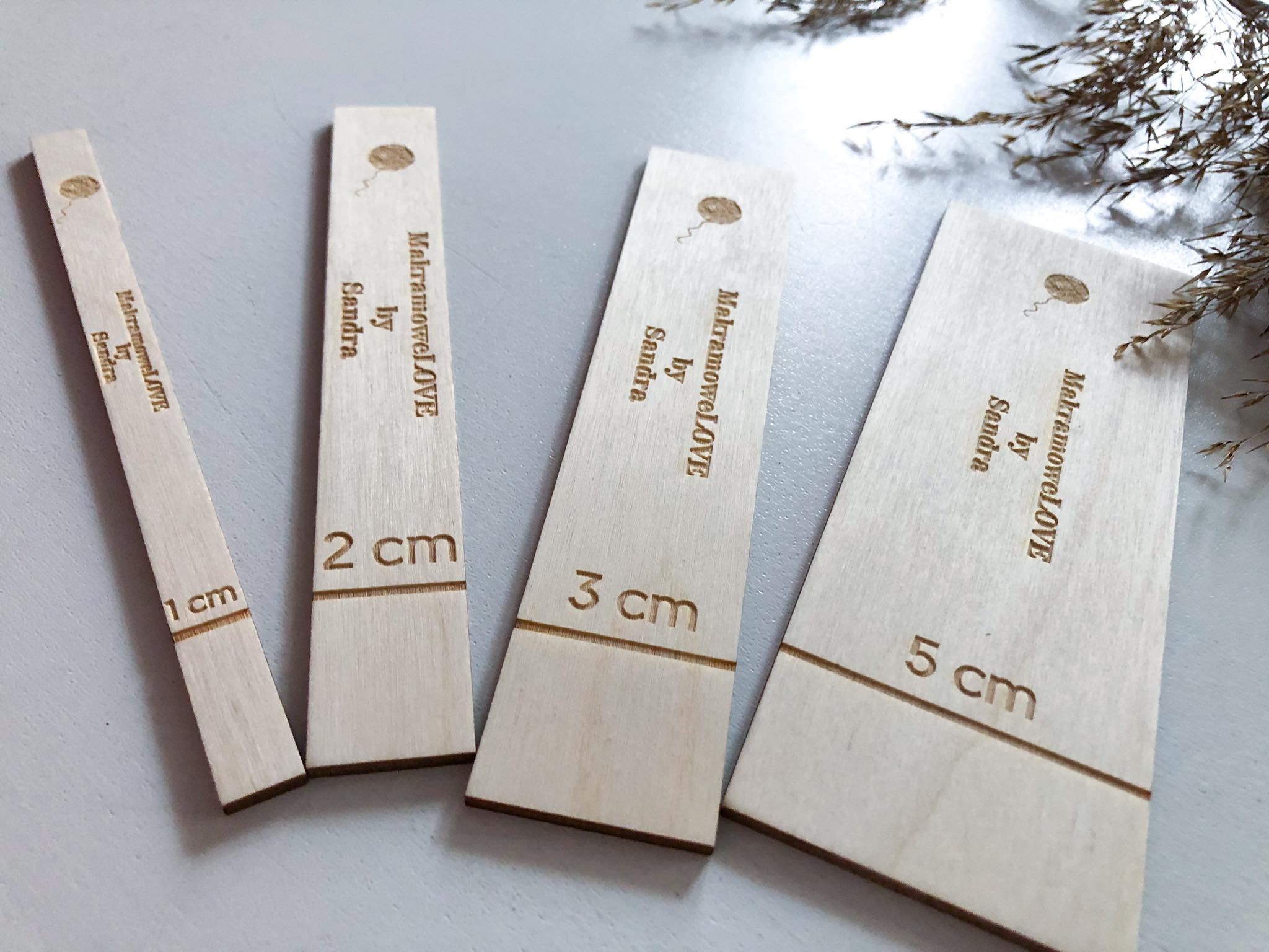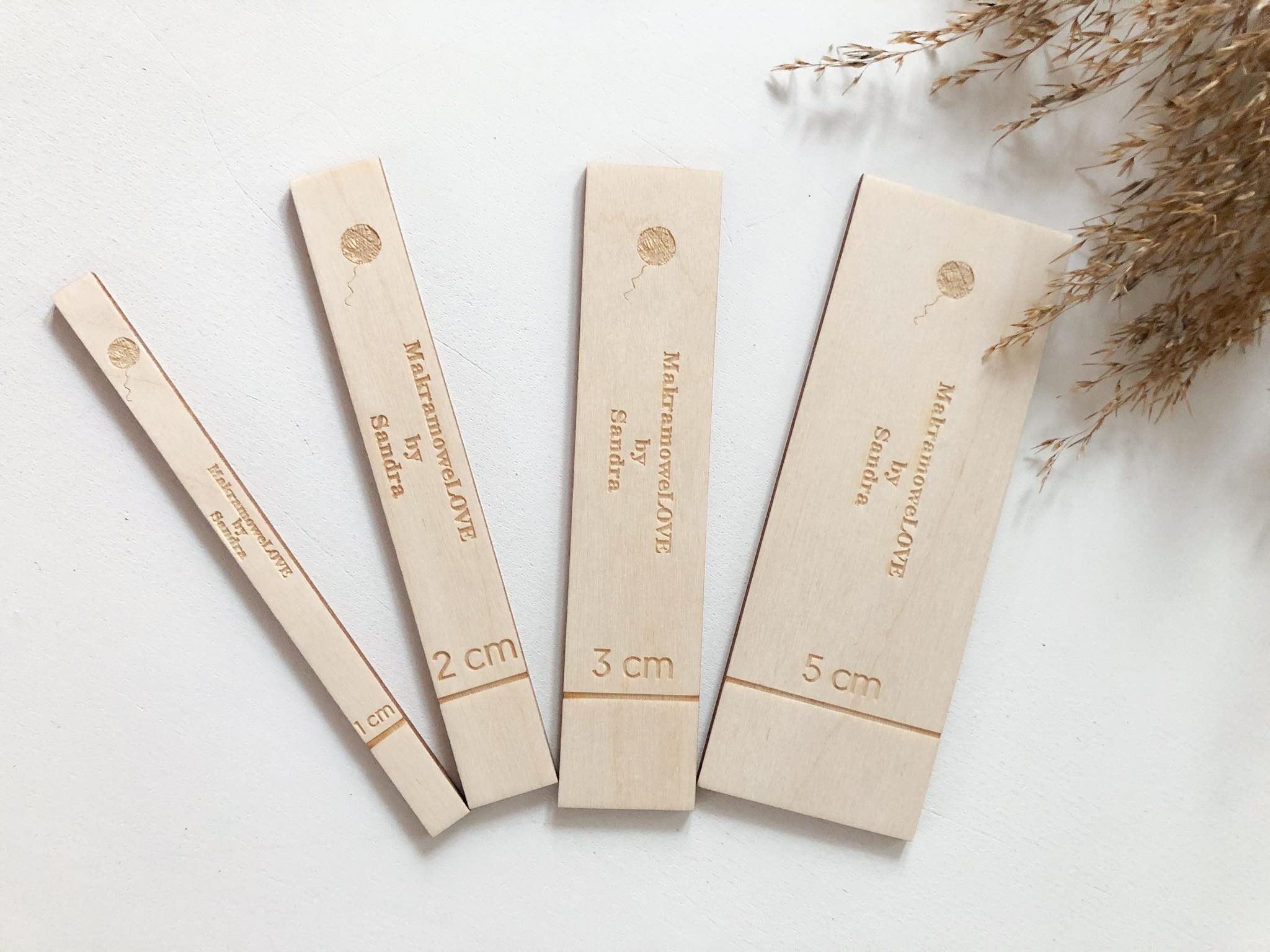 W skład zestawu wchodzą 4 miarki do splotów: 1, 2, 3 i 5 cm.