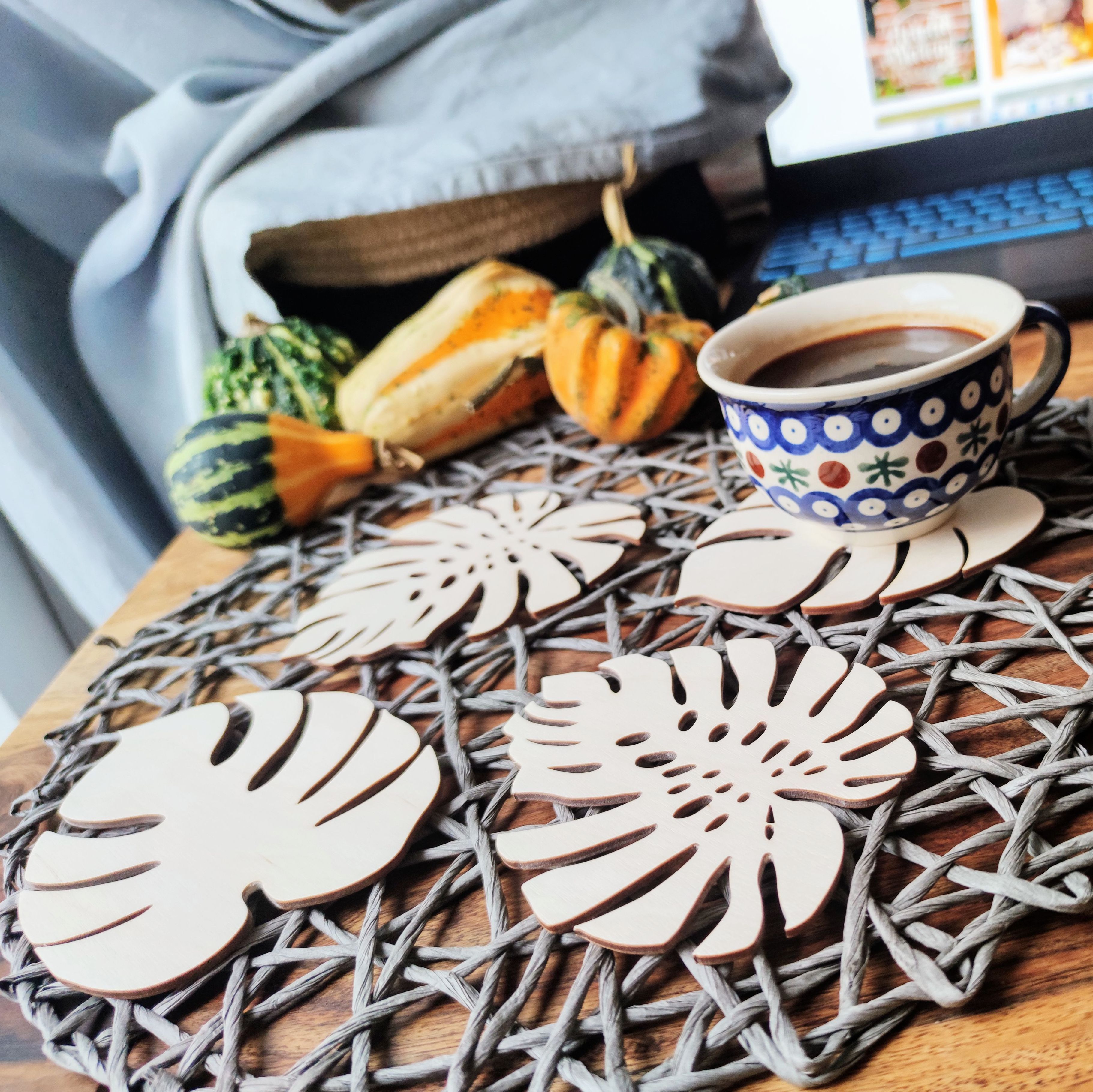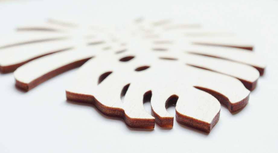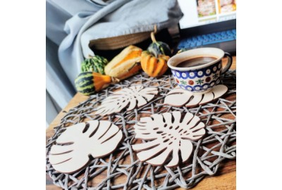 Podkładki wykonane są z drewna (3mm sklejka brzozowa) metodą cięcia laserowego.