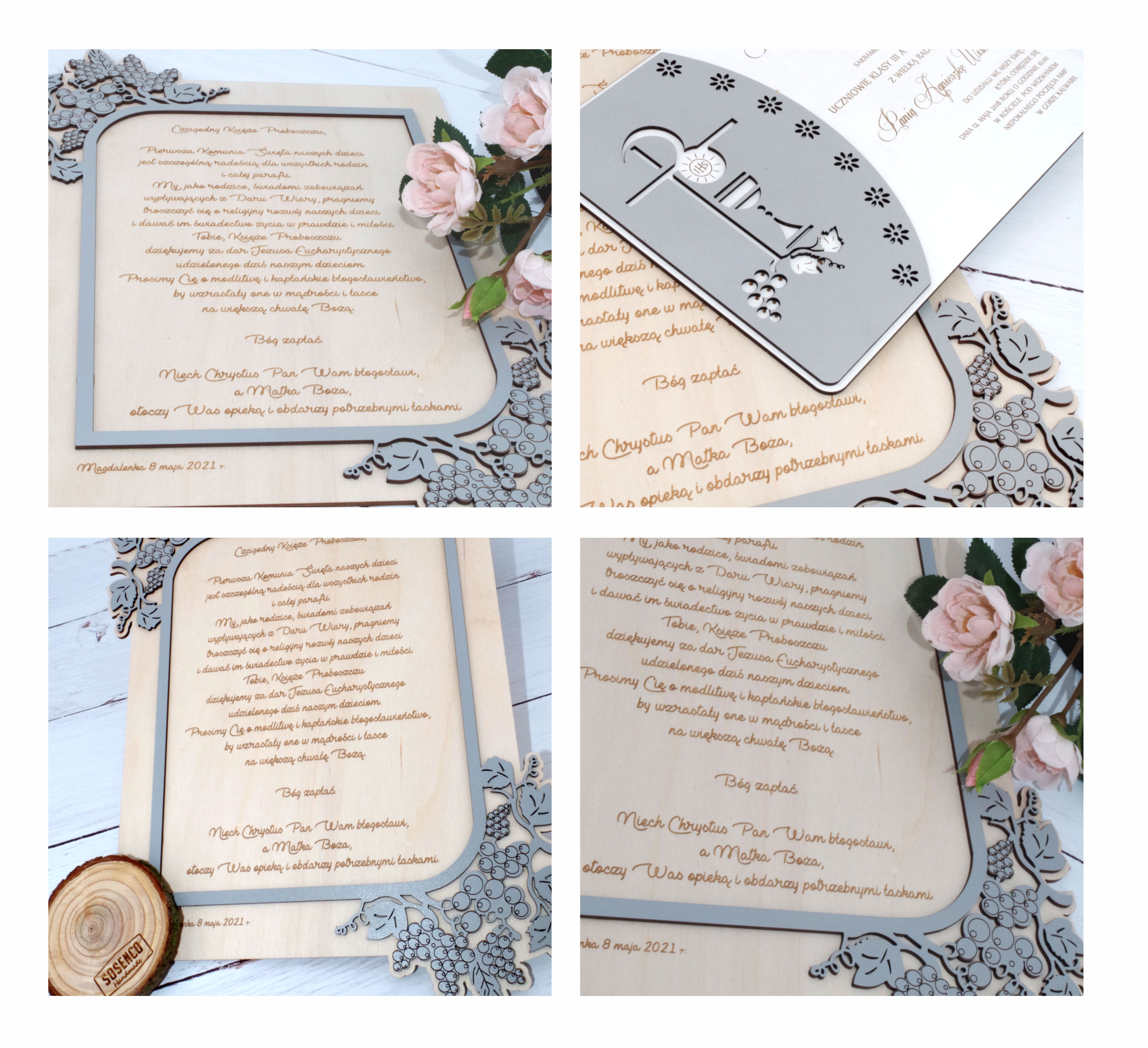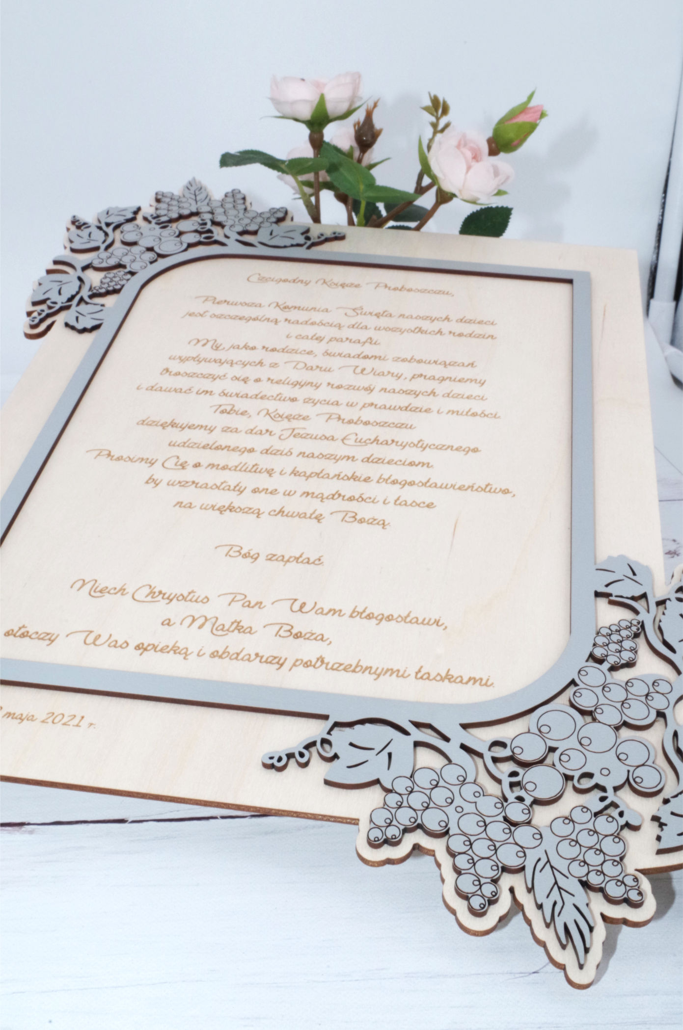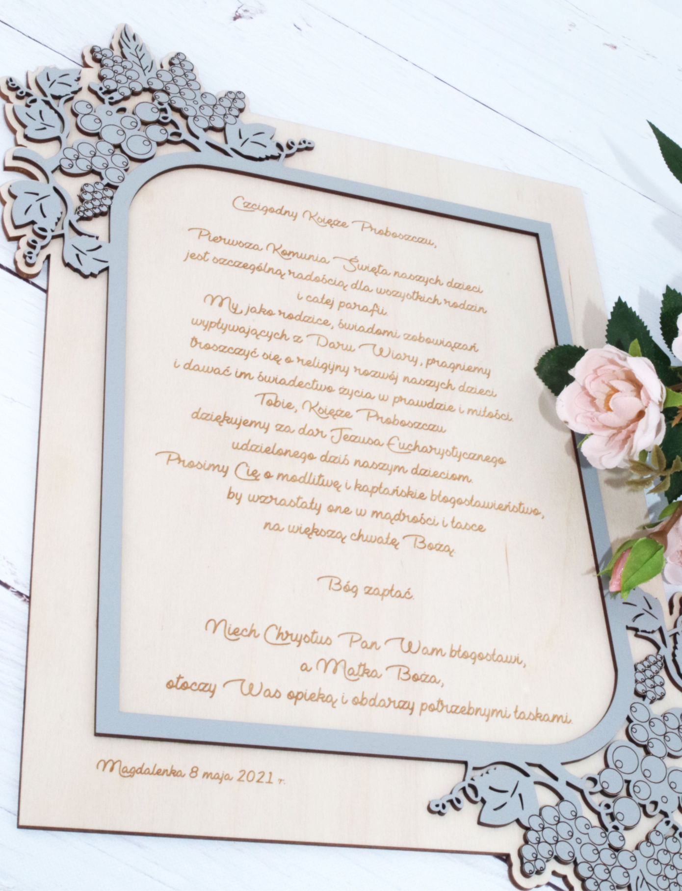 Personalizowane podziękowania komunijne 3D dla Księdza. Podziękowania wykonane ze sklejki brzozowej oraz szarej płyty HDF. Elementy podziękowania są ręcznie klejone.