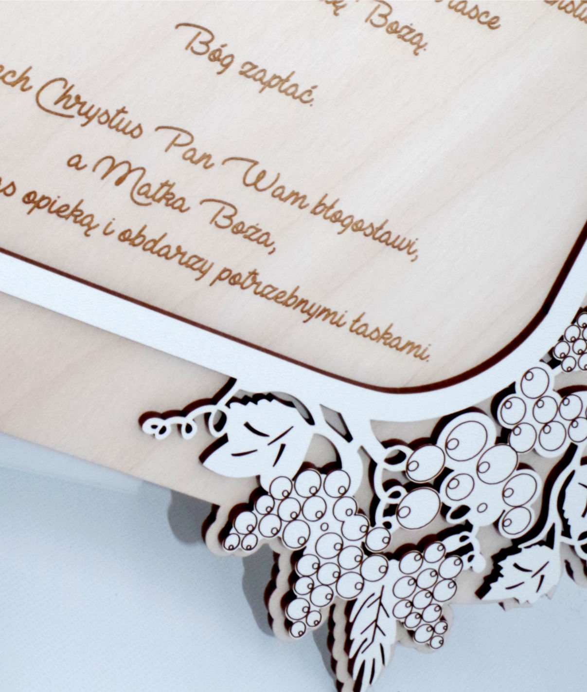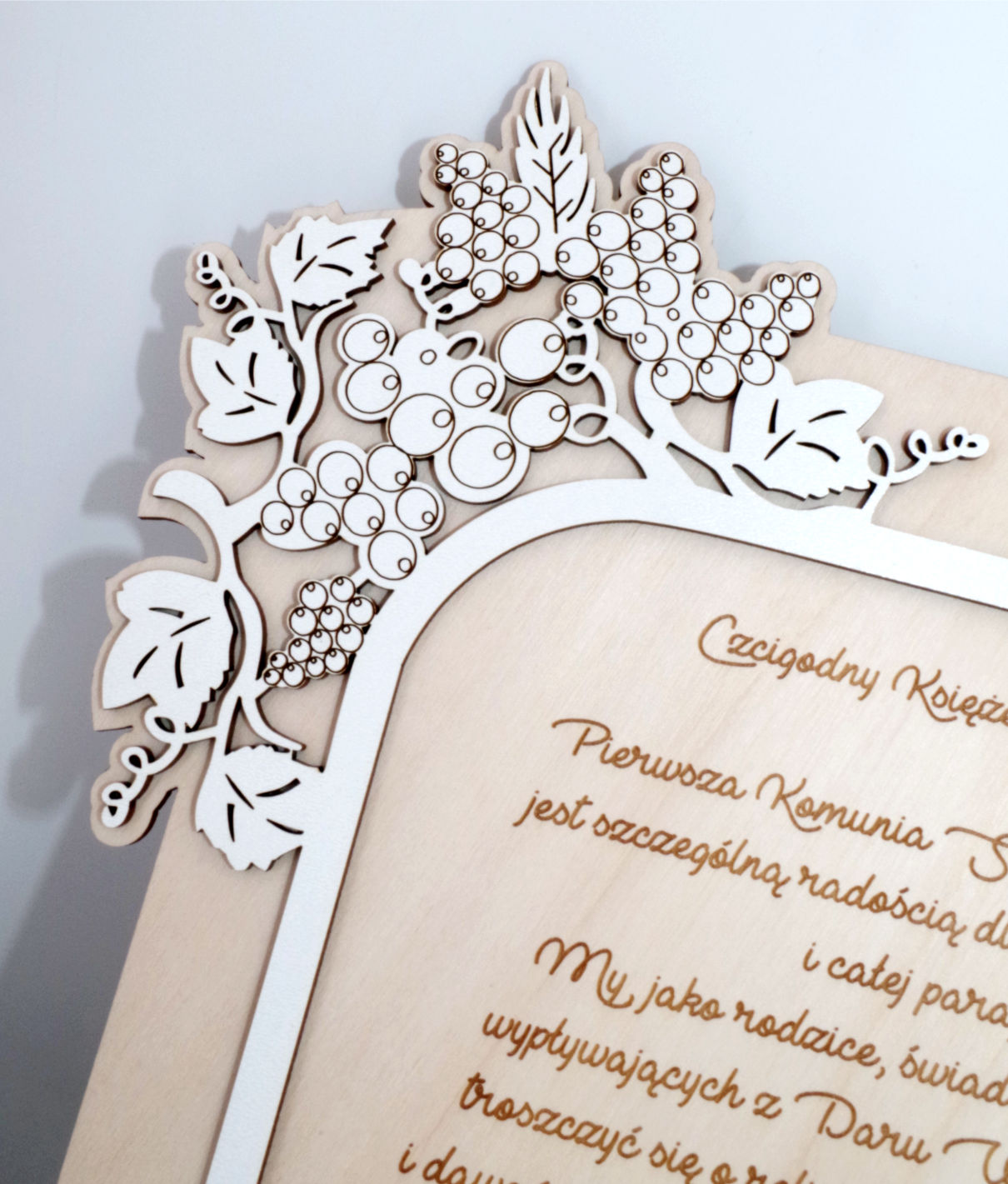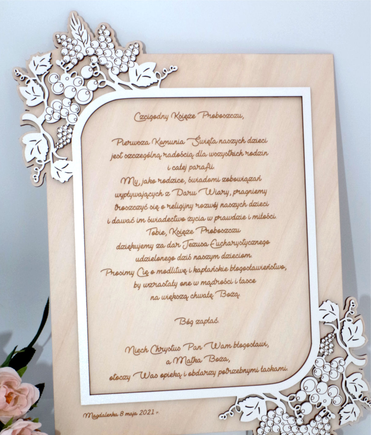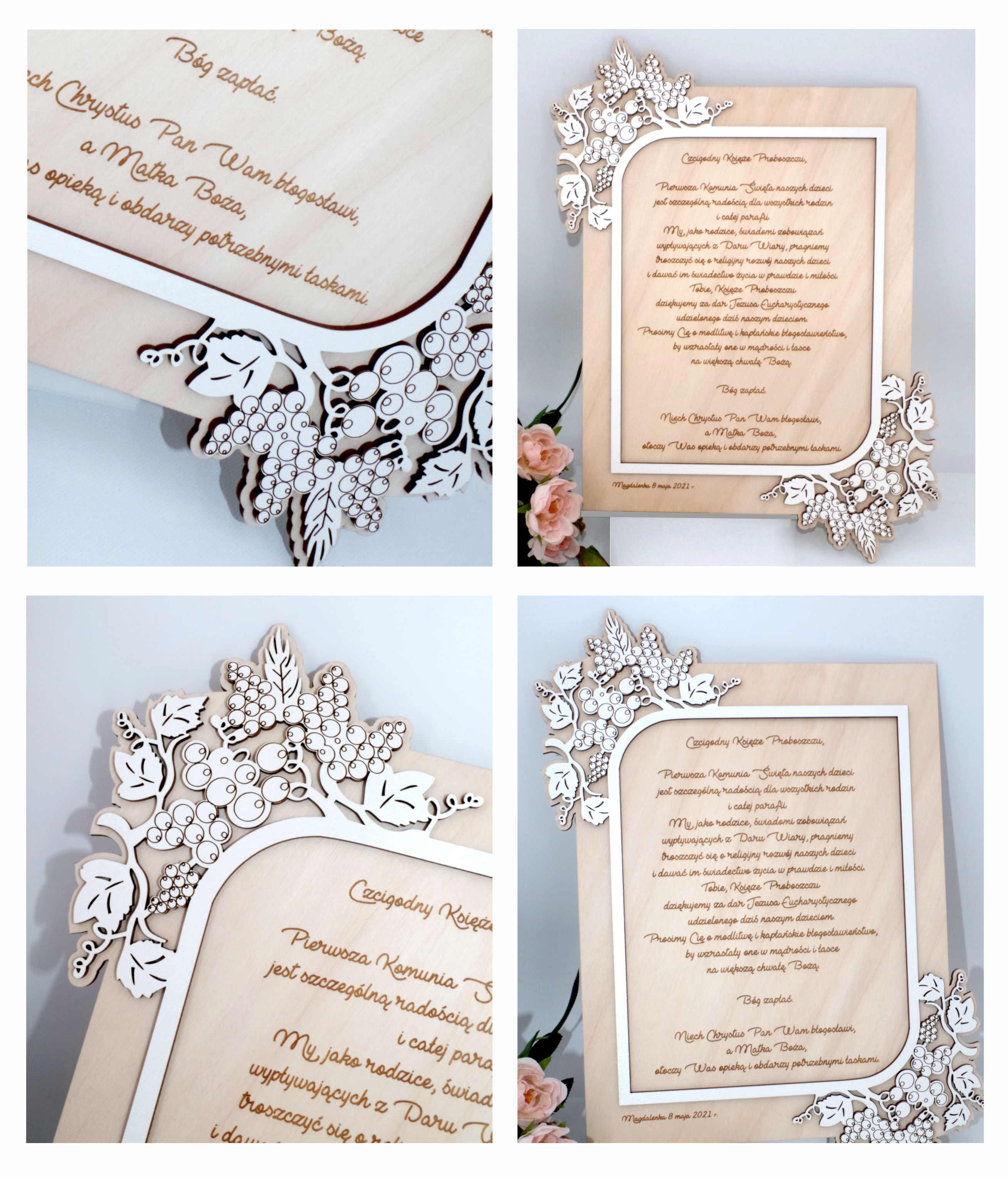 Personalizowane podziękowania komunijne 3D dla Księdza. Podziękowania wykonane ze sklejki brzozowej oraz białej płyty HDF. Elementy podziękowania są ręcznie klejone.