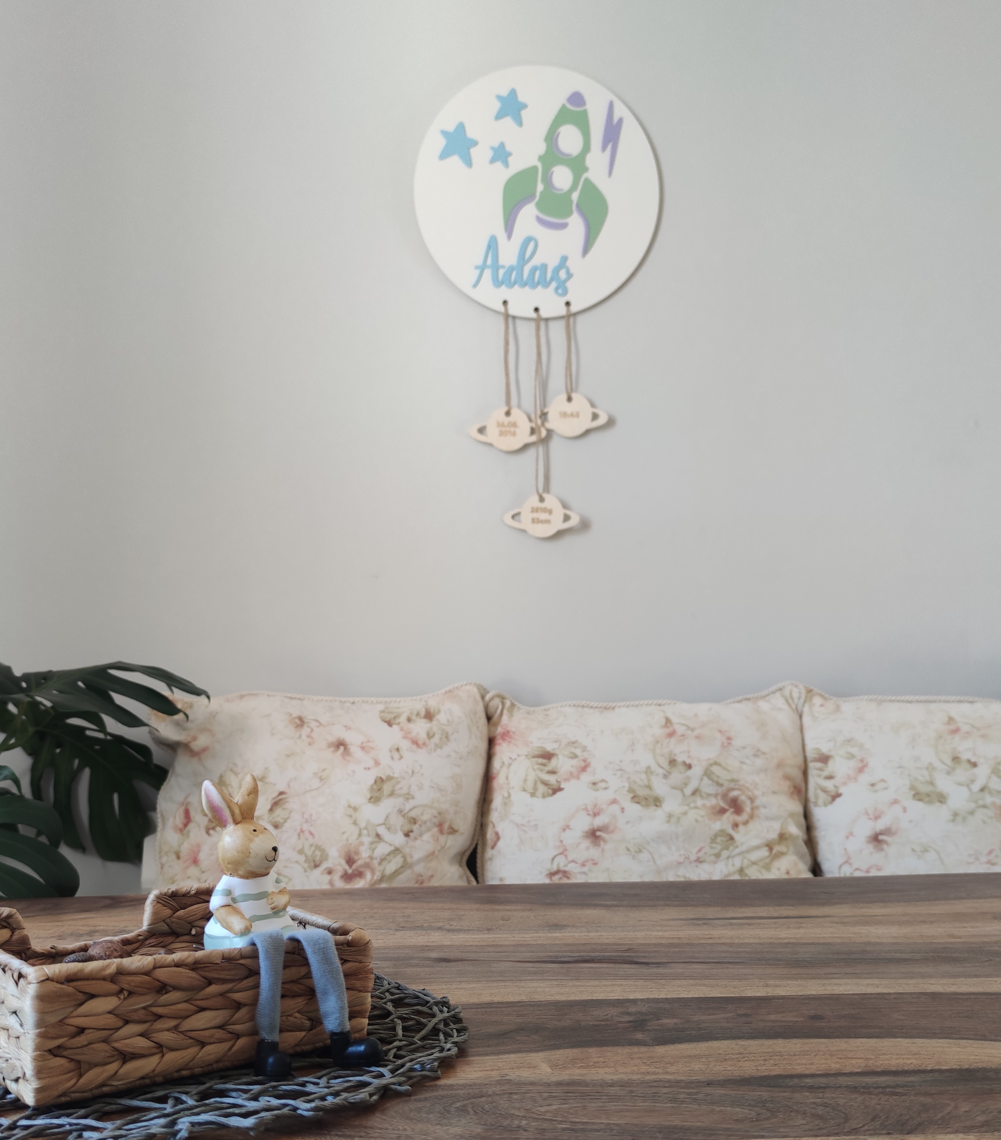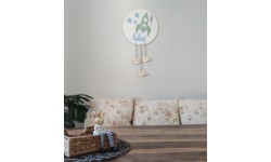 Duża drewniana metryczka z lepionymi elementami z pastelowej plexi.