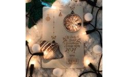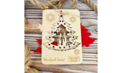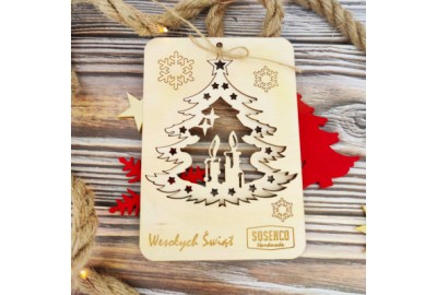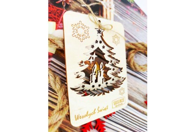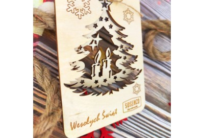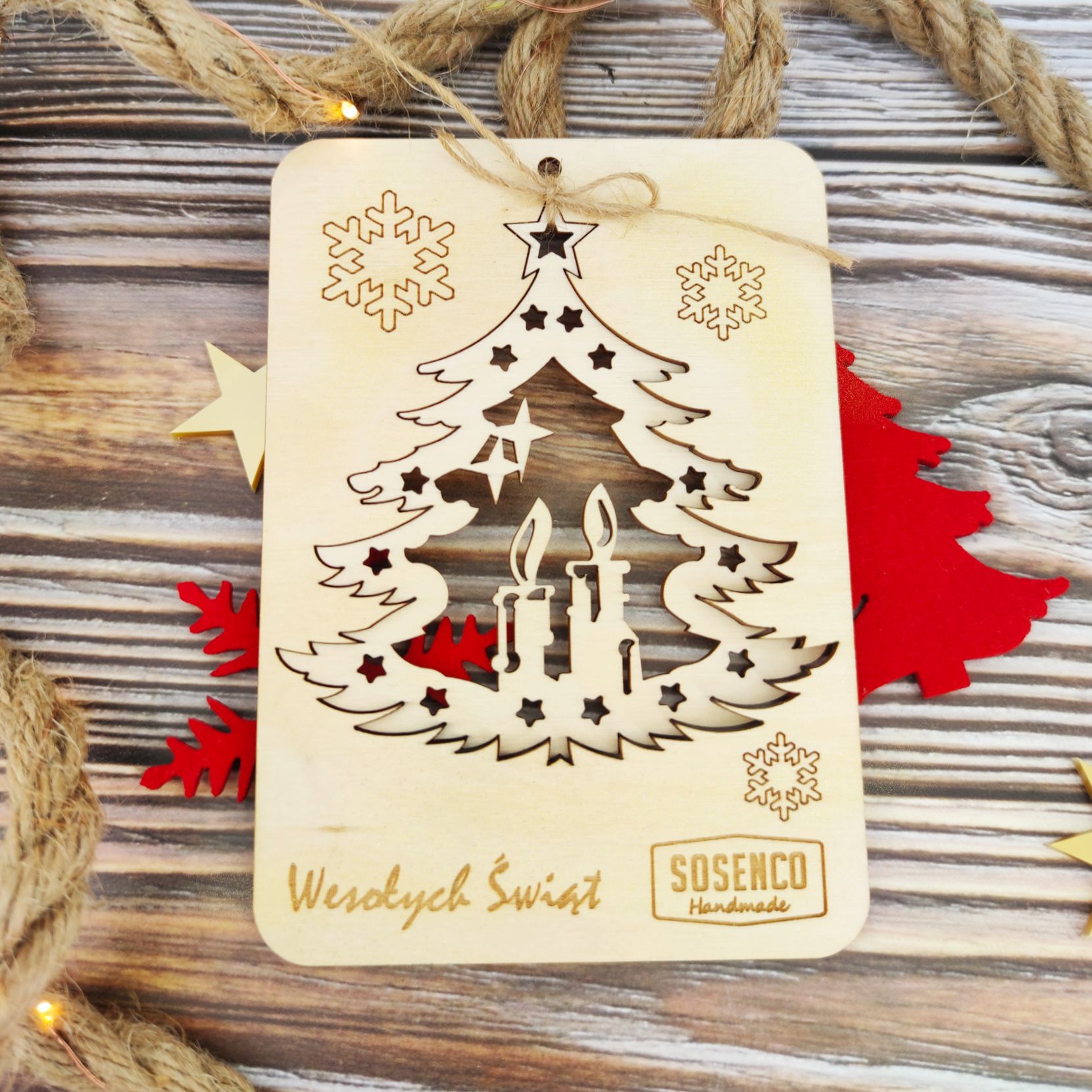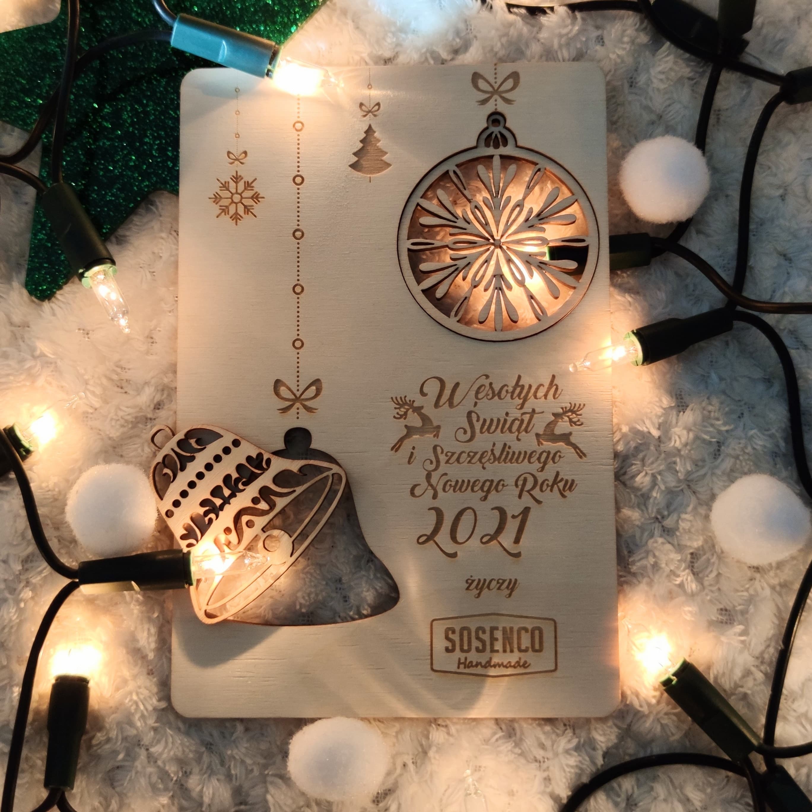 Drewniana kartka świąteczna z personalizowanymi życzeniami.