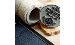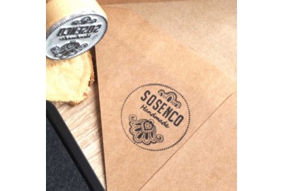 Stempel drewniany z logo lub napisem w zestawie z tuszem.
