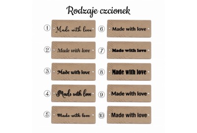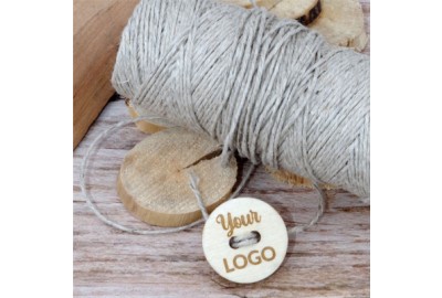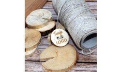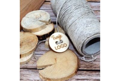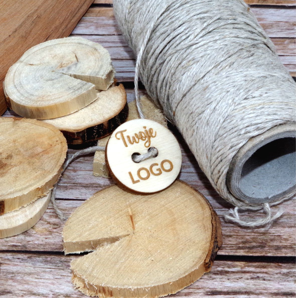 Zestaw drewnianych guzików z logo lub napisem.