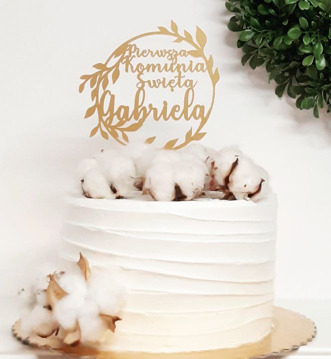 Topper, ozdoba na tort Komunijny, wykonany ze sklejki brzozowej pomalowanej na złoto.