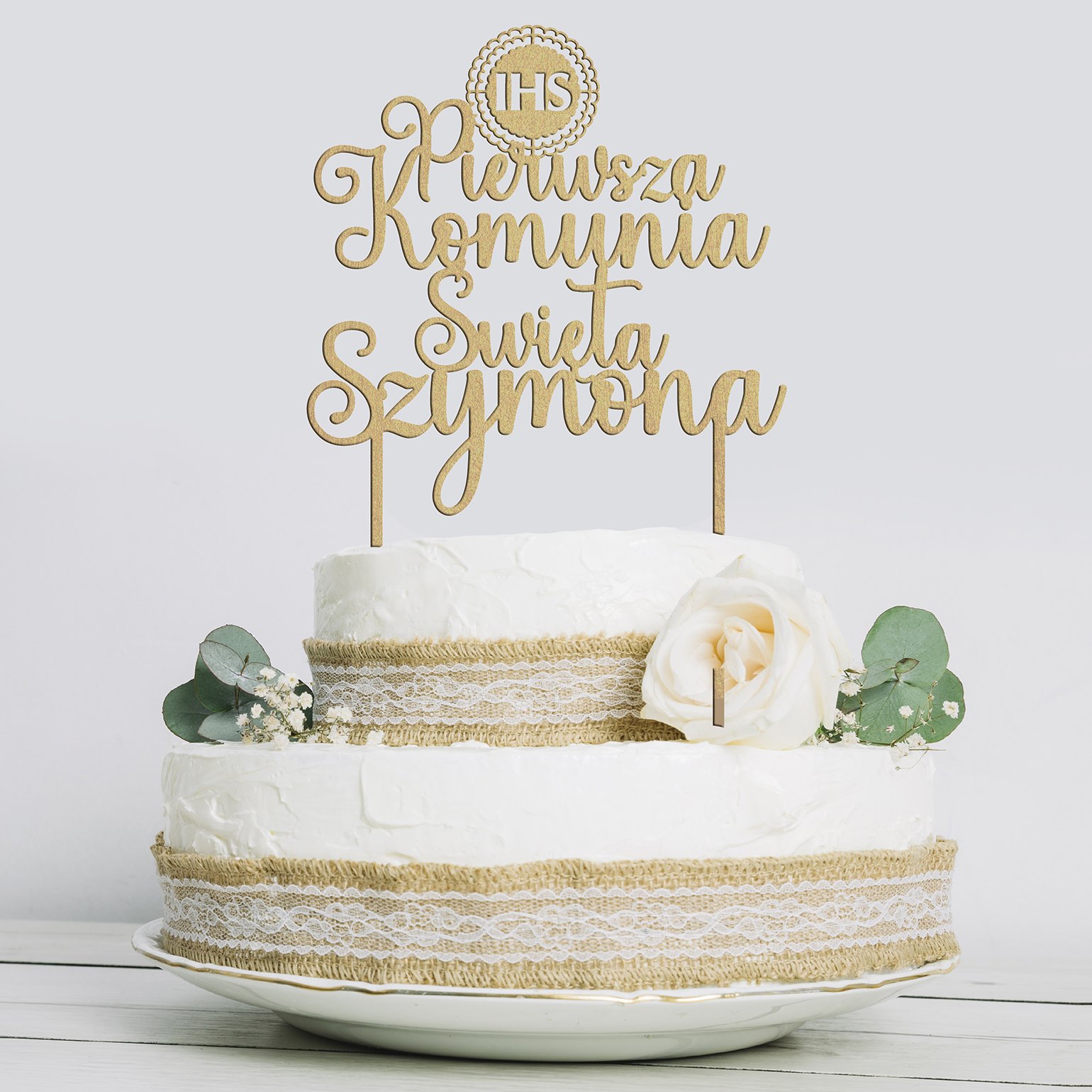 Topper, ozdoba na tort Komunijny, wykonany ze sklejki brzozowej pomalowanej na złoto.