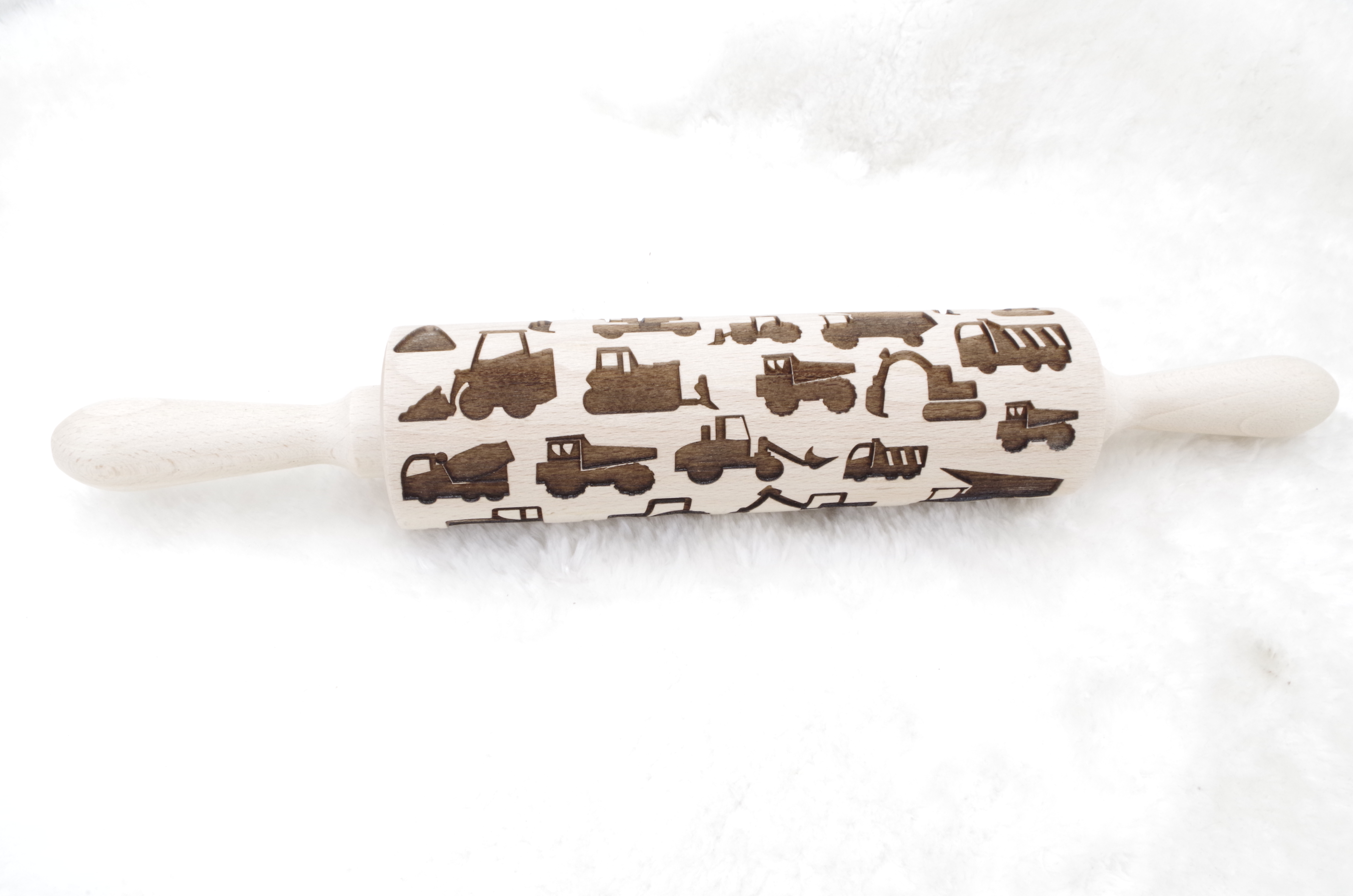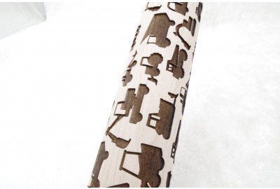 Duży drewniany wałek z wygrawerowanymi maszynami budowlanymi.