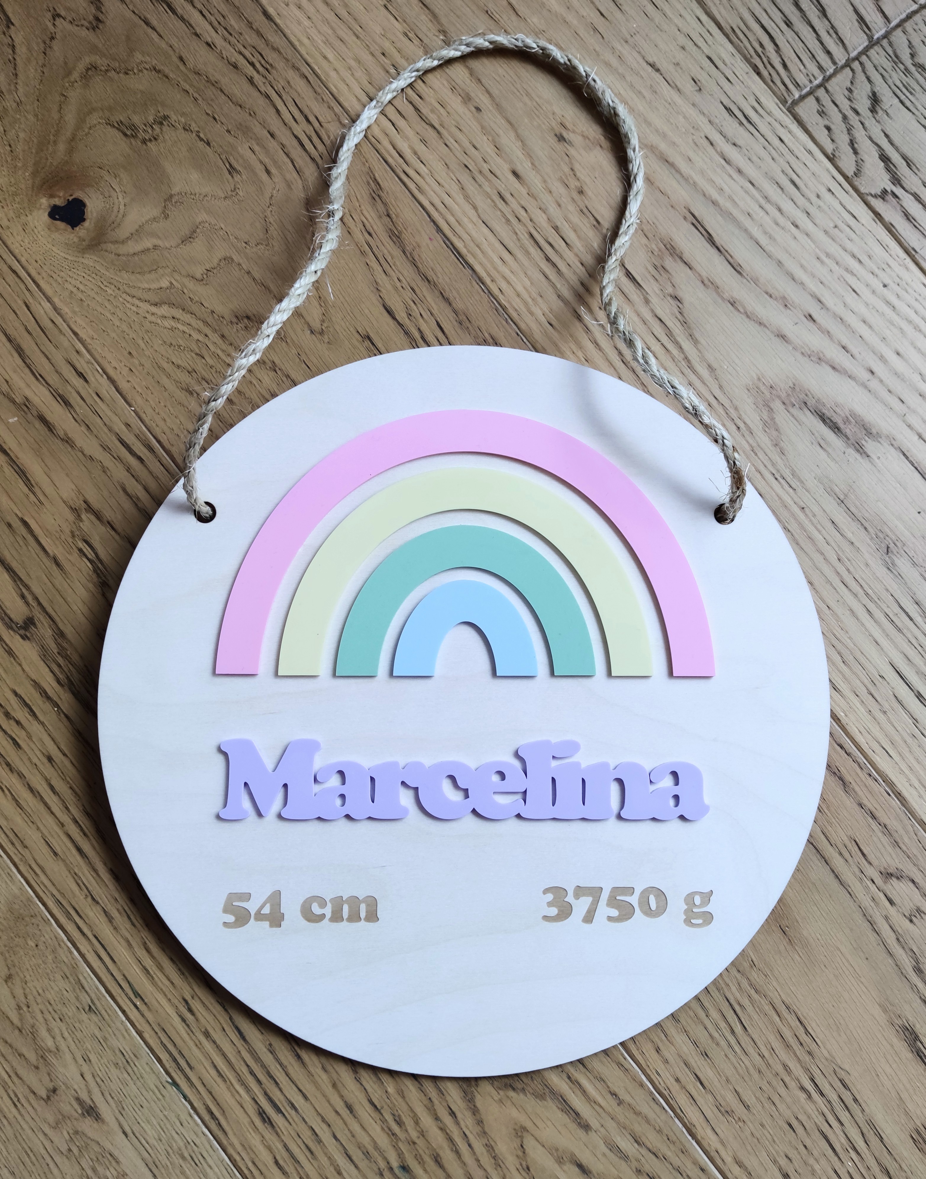 Drewniana metryczka o szerokości 35 cm z tęczą z pastelowej plexi.