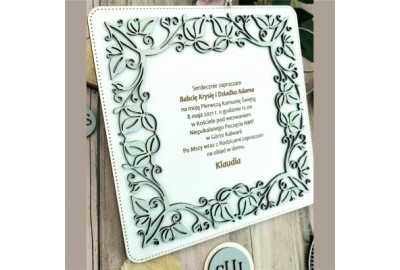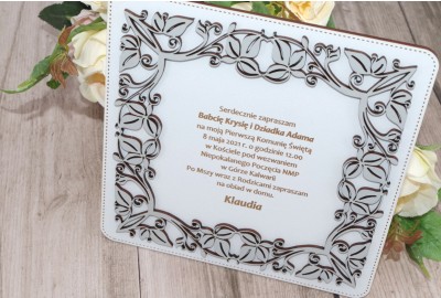 Personalizowane zaproszenie 3D na Komunię z brązową, ozdobną kopertą. Zaproszenie wykonane z płyt HDF, podstawa to biały kolor, następnie druga warstwa to płyta HDF w kolorze szarym lub złotym. Elementy zaproszenia są ręcznie klejone.