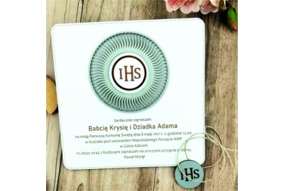 Personalizowane zaproszenie 3D na Komunię z brązową, ozdobną kopertą. Zaproszenie wykonane z płyt HDF, podstawa to biały kolor, następnie druga warstwa to płyta HDF w kolorze szarym lub złotym. Elementy zaproszenia są ręcznie klejone.