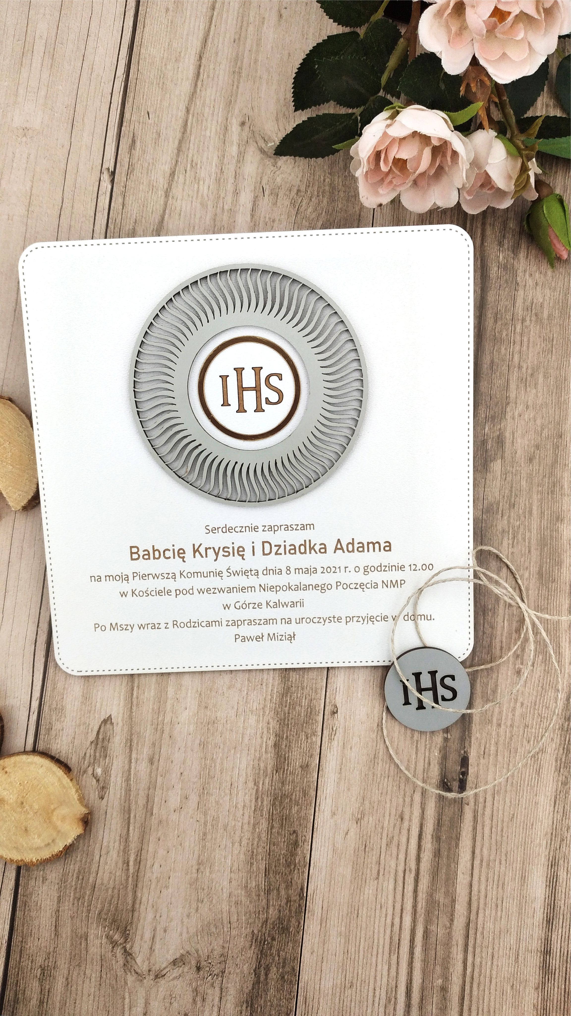 Personalizowane zaproszenia 3D na Komunię z brązowymi, ozdobnymi kopertami. Zaproszenia wykonane z płyt HDF, podstawa to biały kolor, następnie druga warstwa to płyta HDF w kolorze szarym lub złotym. Elementy zaproszeń są ręcznie klejone.