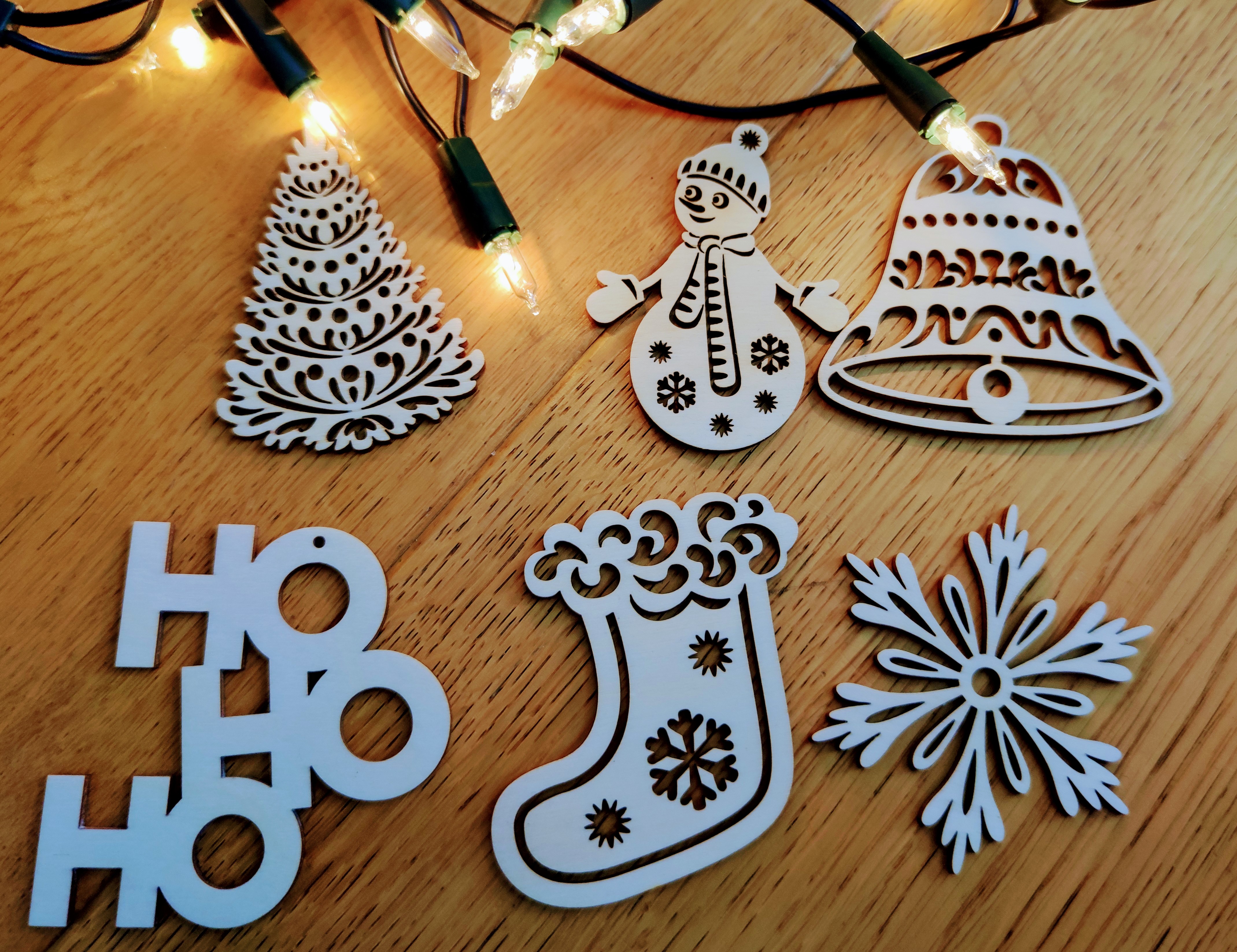 Drewniana kartka z życzeniami świątecznymi z dwiema wypychanymi zawieszkami.