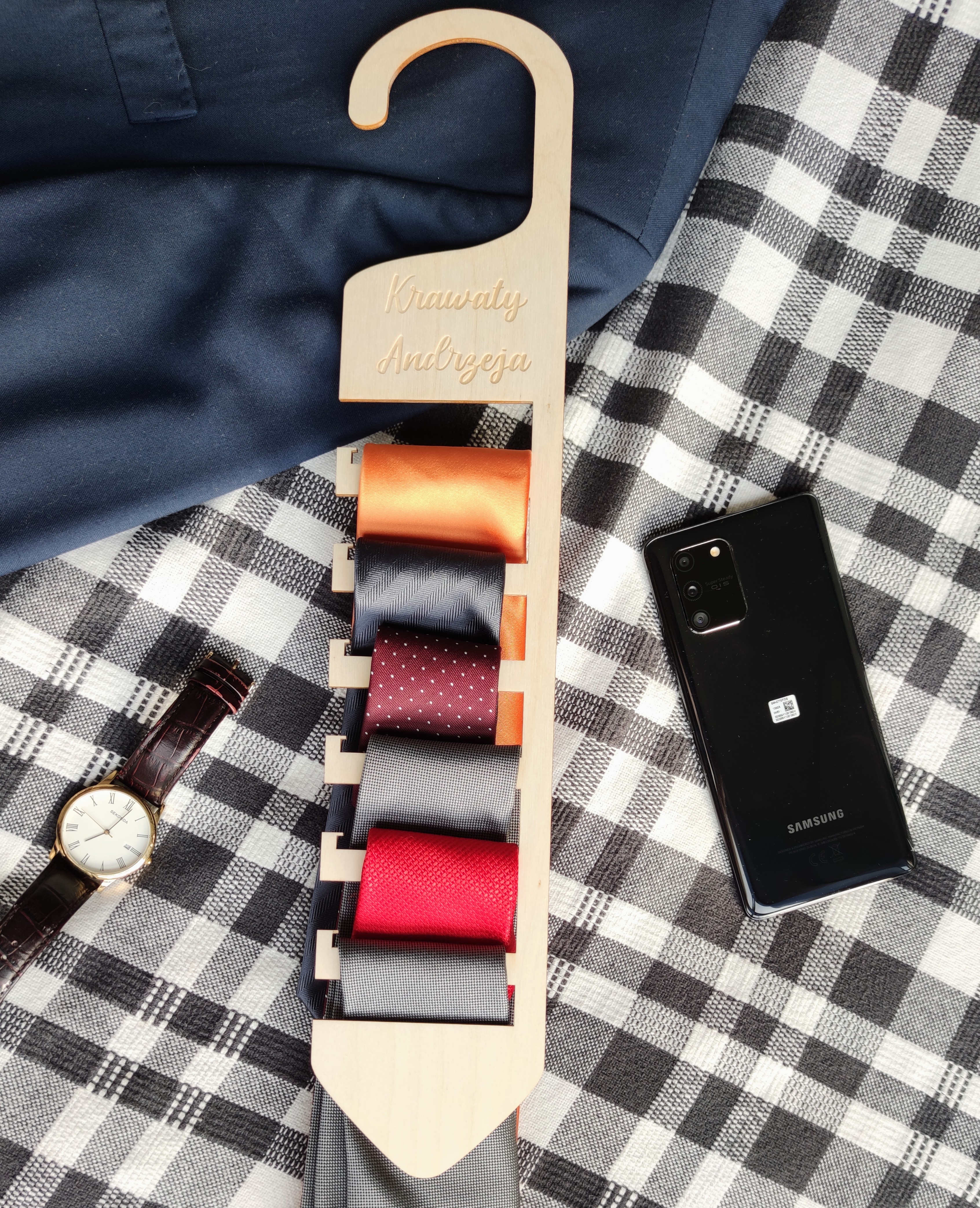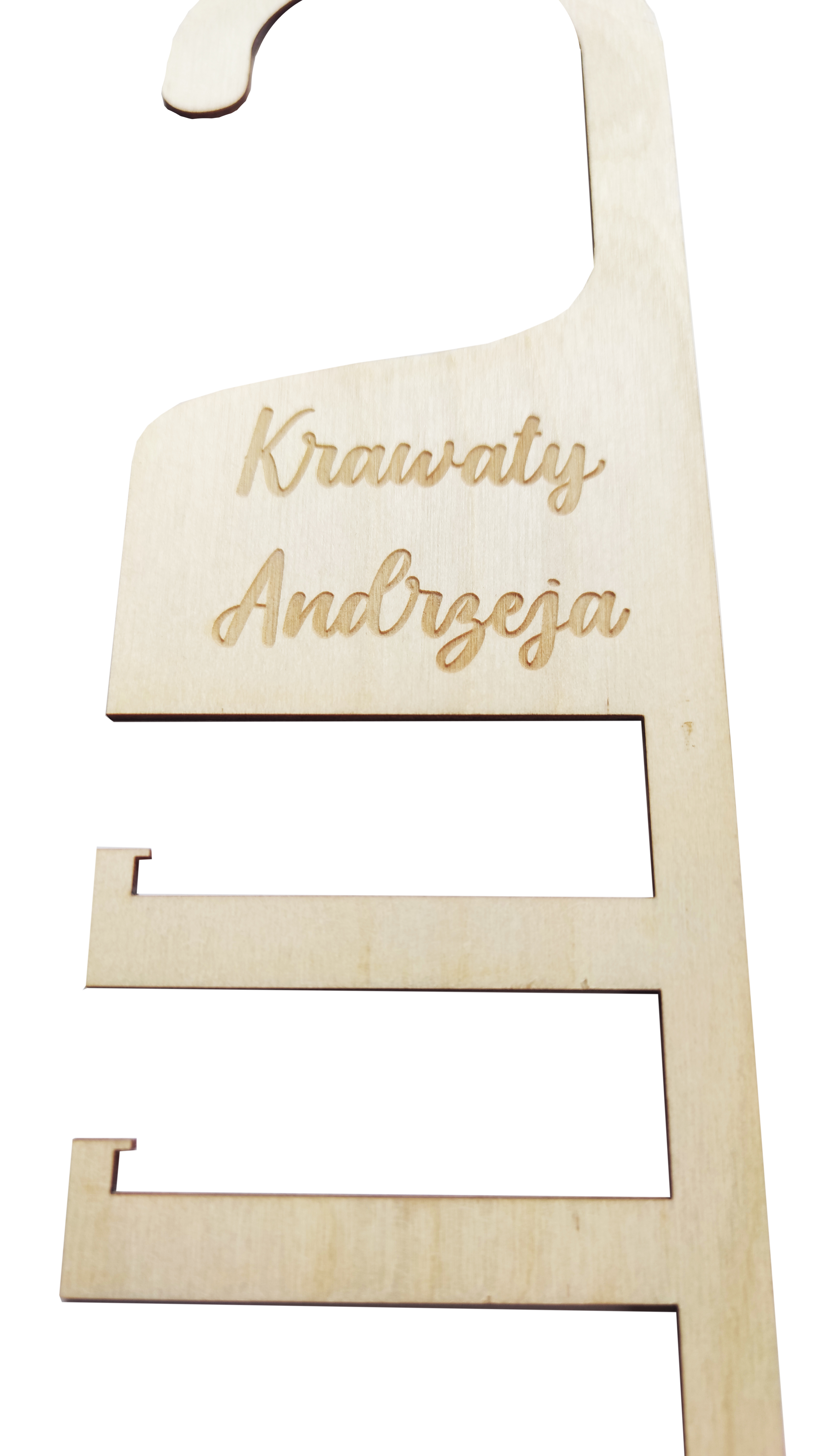 Drewniany wieszak na krawaty z logo lub napisem.