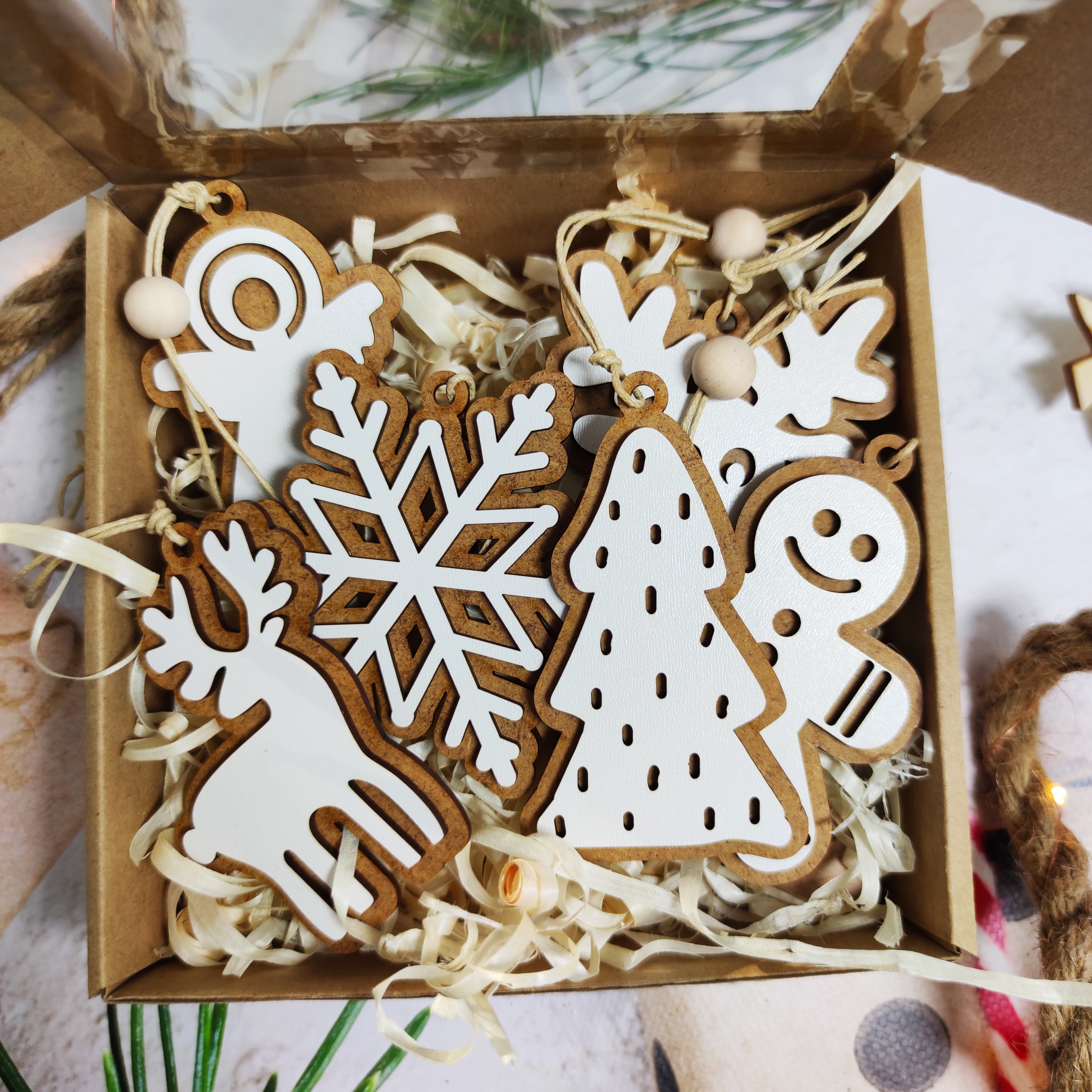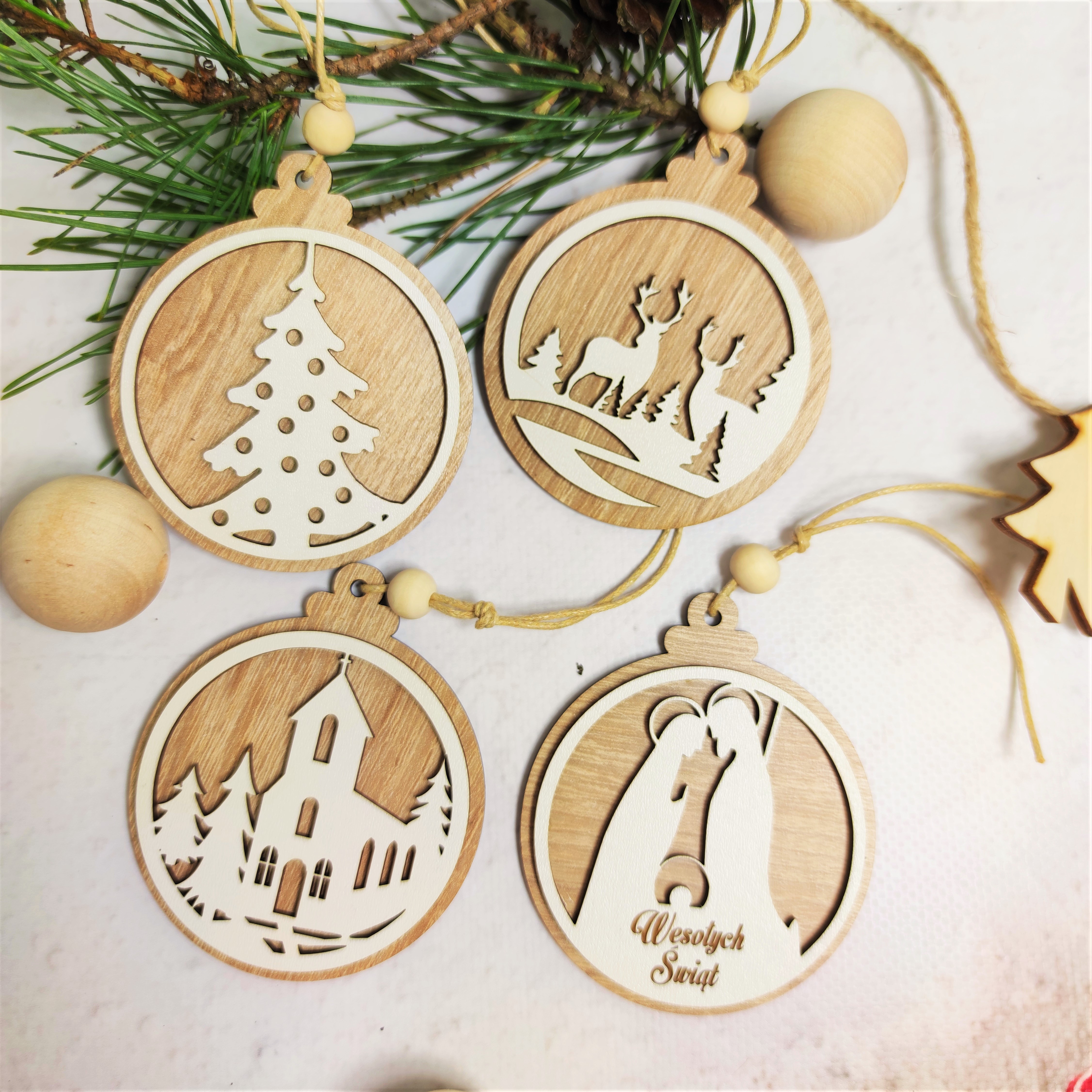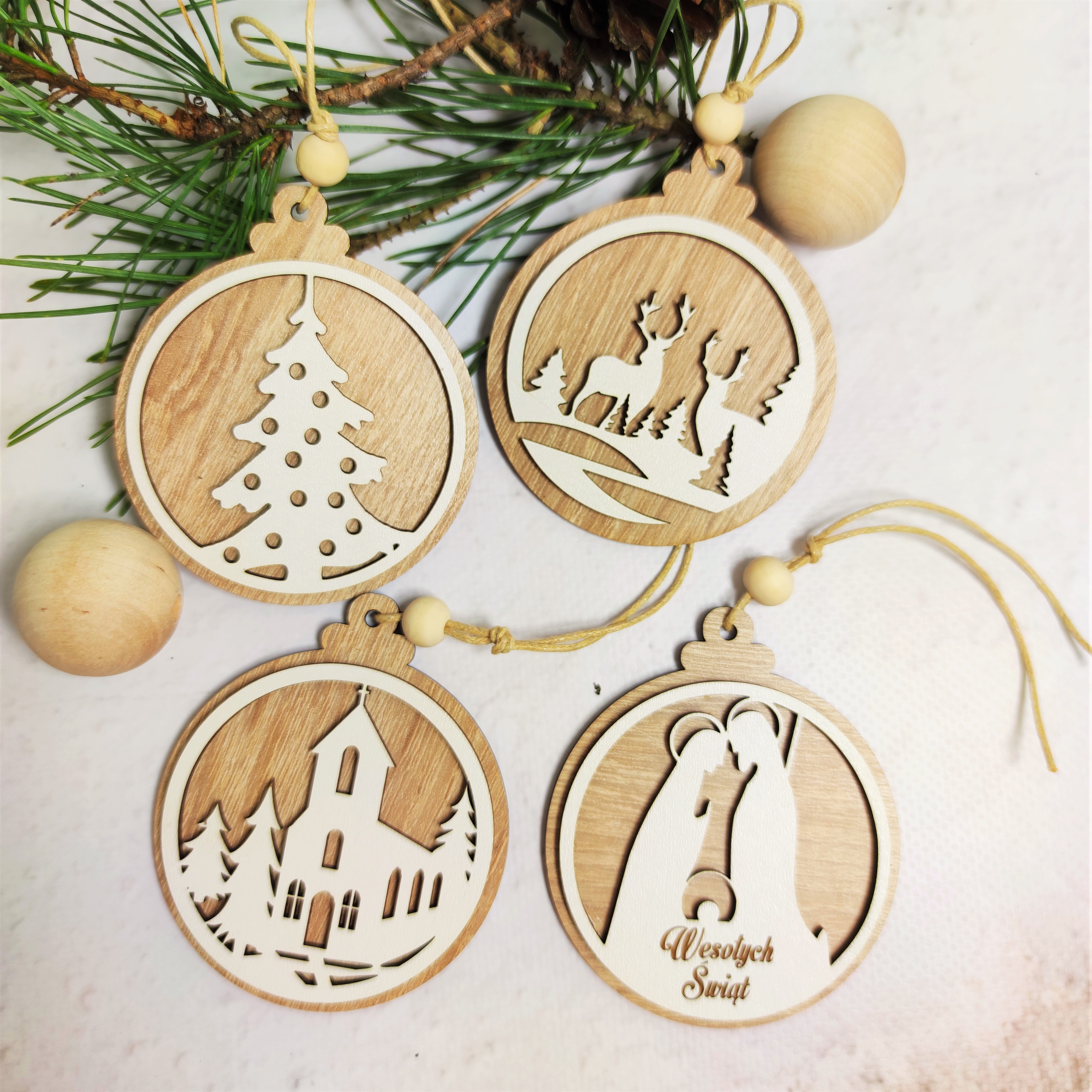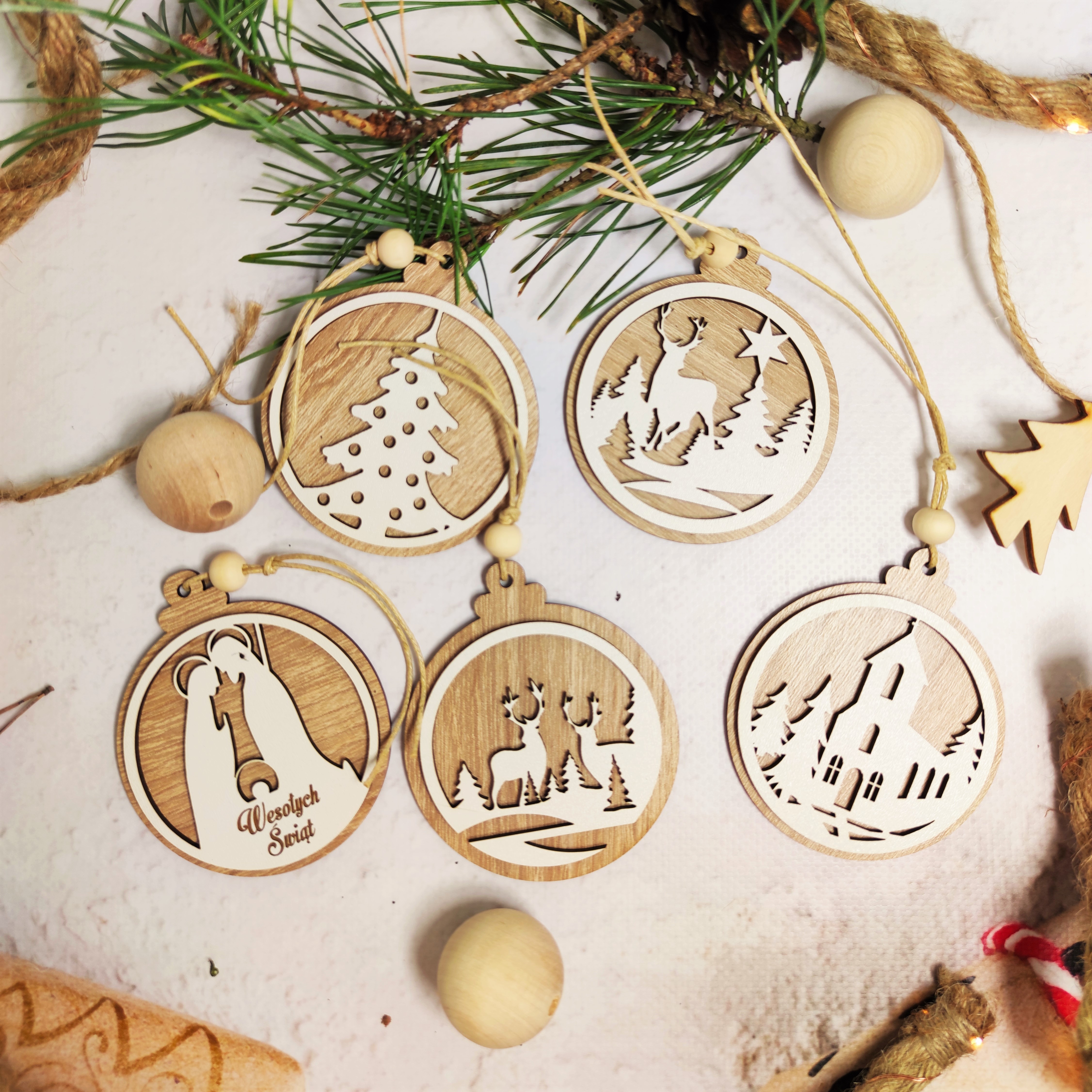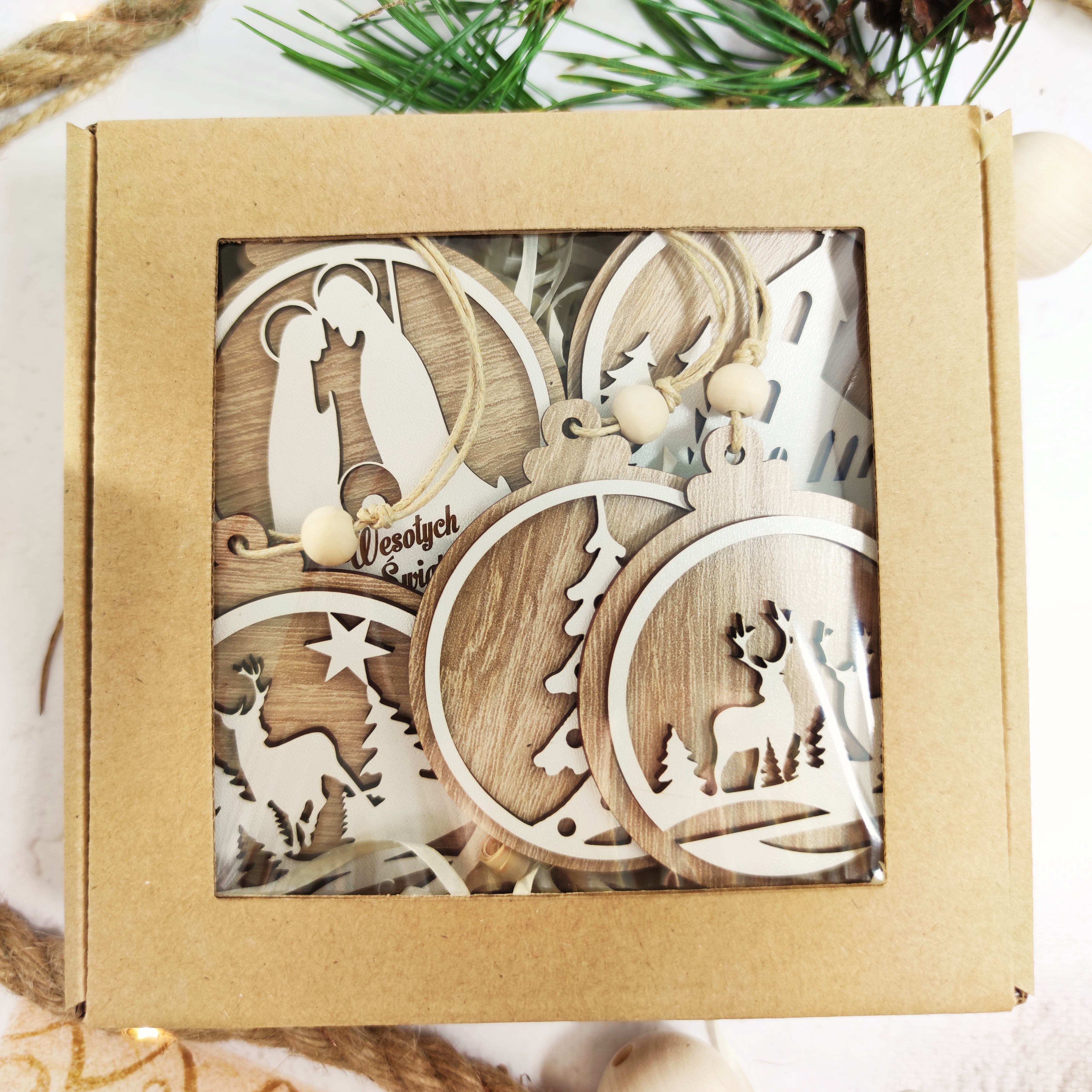 Piękny zestaw świąecznych ozdób choinkowych. Zaprojektowany i wykonany w naszej pracowni w Polsce. Każda bombka składa się z dwóch warstw. Dodatkowo w zestawie znajdują się zawieszki i koraliki a by dodać zawieszkom jeszcze większej elegancji. Bombki spakowane są w pudełeczko z okienkiem dzięki czemu mogą być wspaniałym prezentem świątecznym.