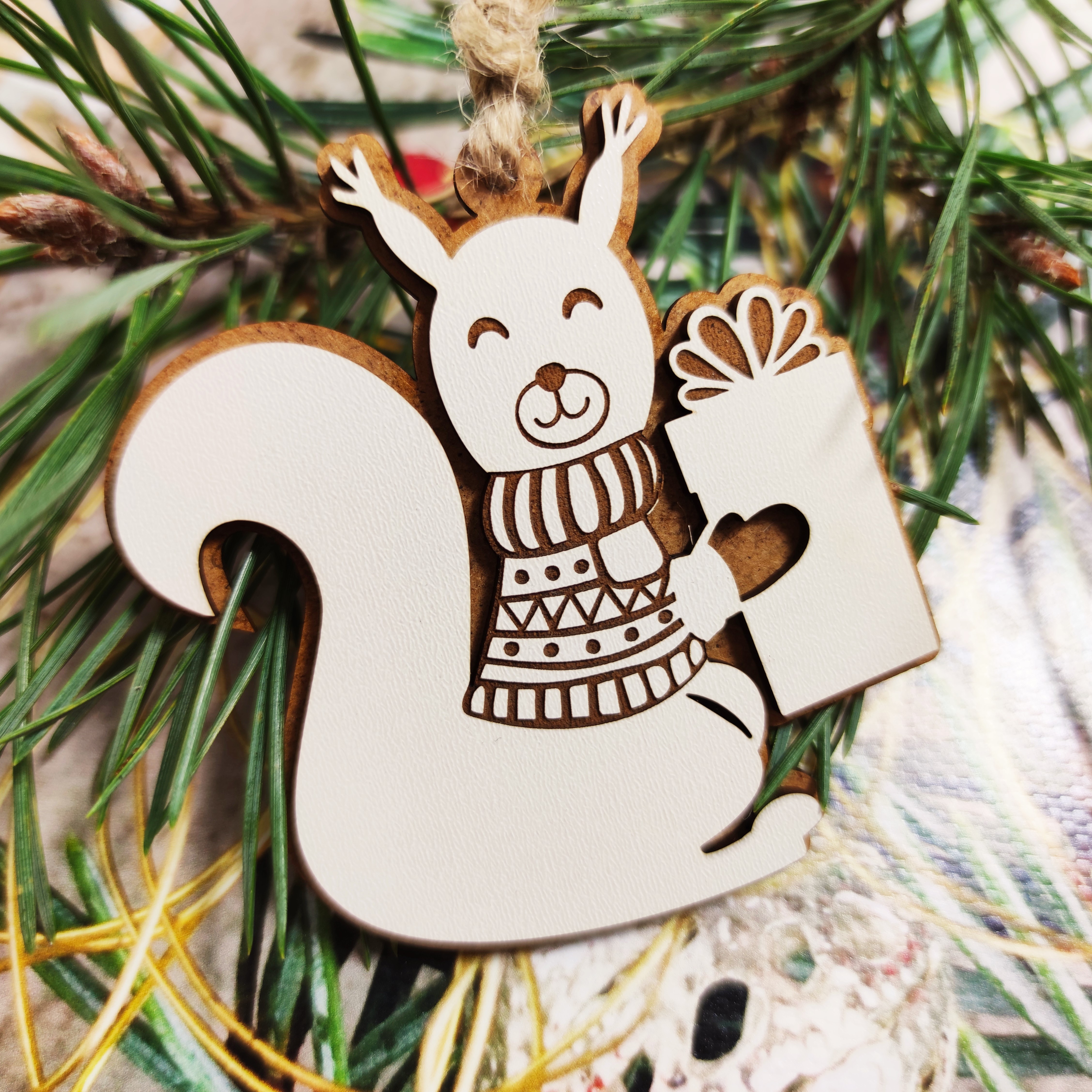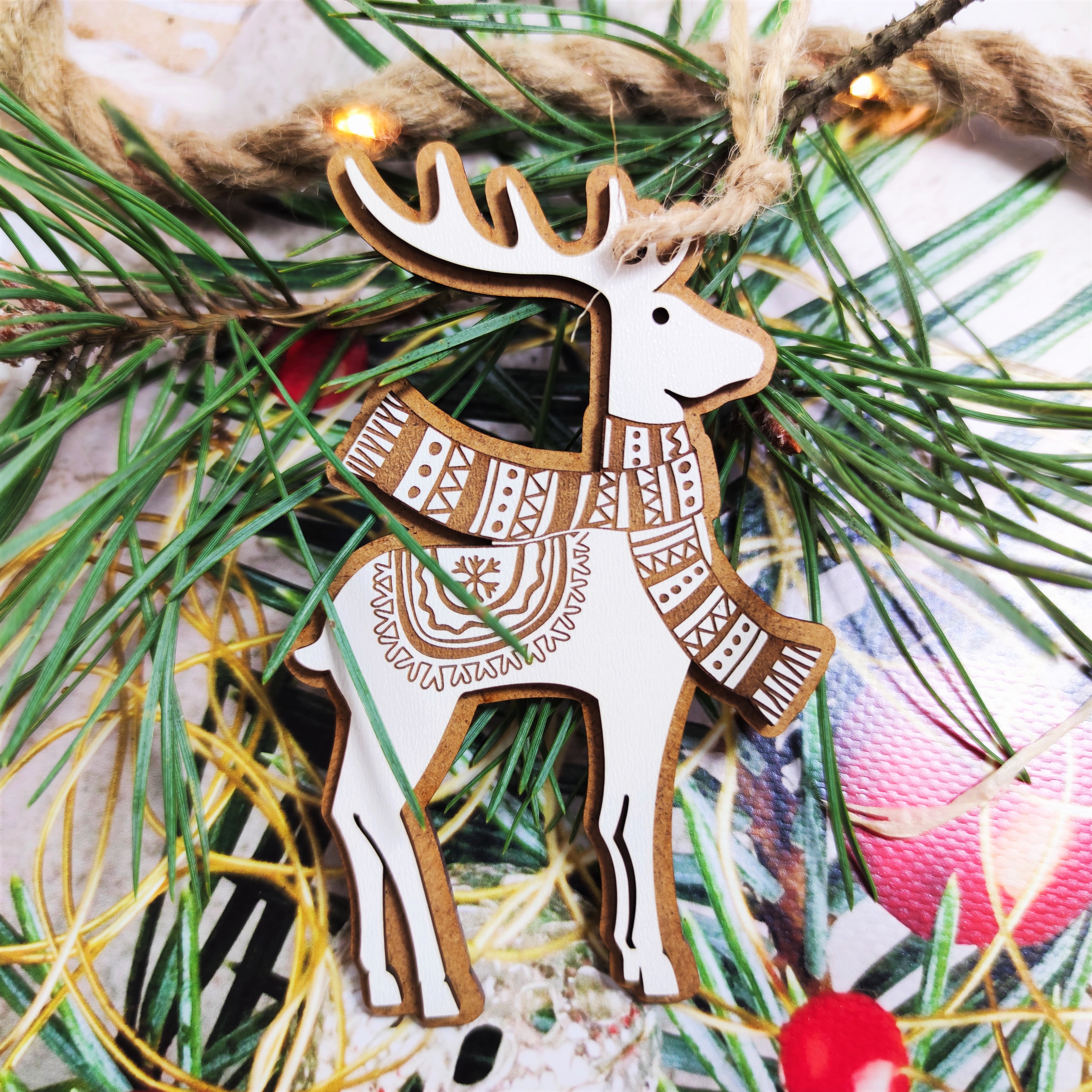 Zestaw w kolorze białym z grawerem w kolorze brązowym. Podkład w kolorze brązowym. Każda ozdoba składa się z dwóch warstw.